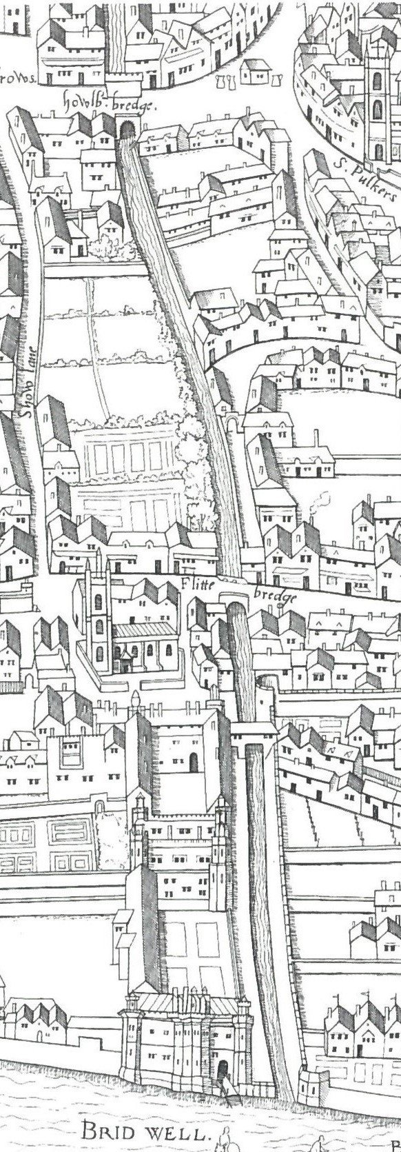 The southern reaches of the Fleet, as shown on the “Copperplate” map of London surveyed between 1553 and 1559